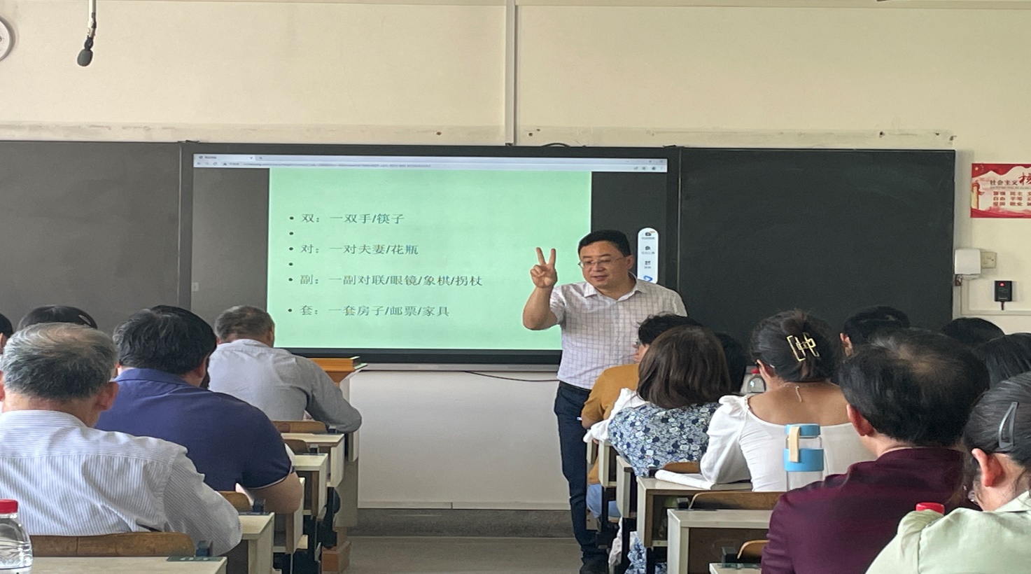 2022年5月5日下午,由教务处、教学质量监测与评估中心主办,bevictor伟德官网汉语国际教研室、现代汉语教研室承办的观摩课在教育大楼1205教室开讲。bevictor伟德官网院长李治平教授主讲“现代汉语量词”,罗姝芳老师主持本次活动。教务处副处长、评估办副主任黄海军,bevictor伟德官网副院长王成、彭江浩,校级教学督导、文科专业新进教师和bevictor伟德官网6个教研室的23名教师、中文1902班学生参加了此次活动。