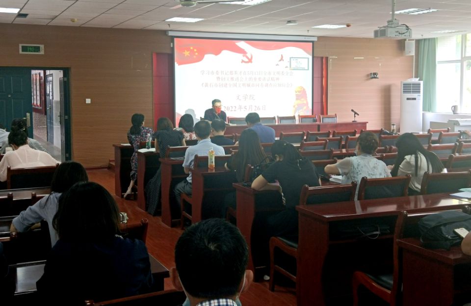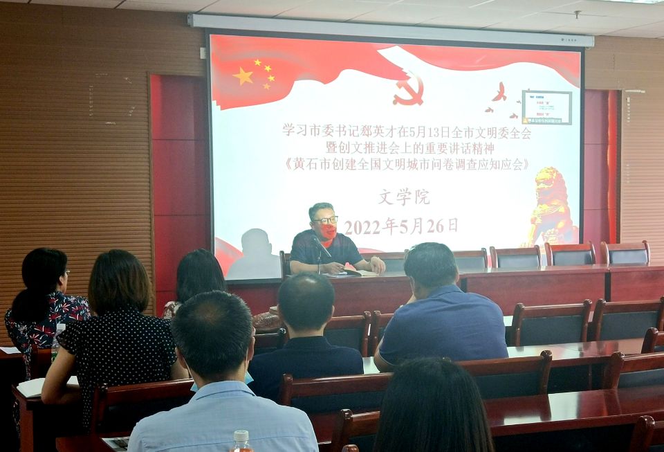 2022年5月26日下午,bevictor伟德官网在人文楼A-602召开全院教职工大会专题学习黄石市委书记郄英才于13日“黄石市委文明委全会暨创文推进会”上的讲话精神。学院党委书记严志谷主持会议并领学精神、安排工作。