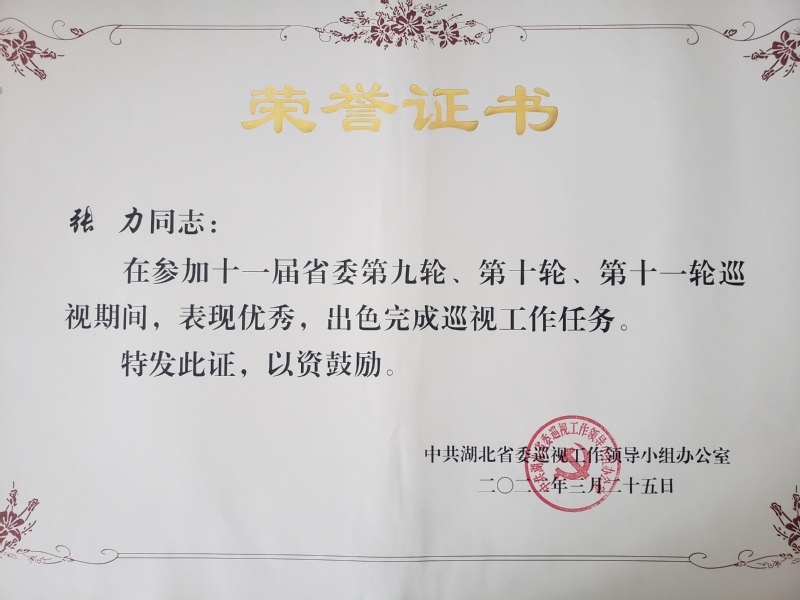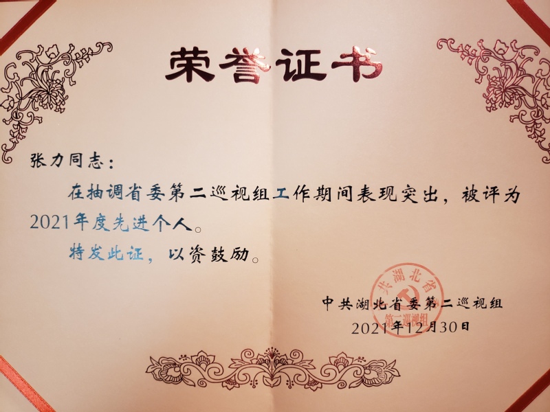 2021年6月至2021年12月,根据工作需要,bevictor伟德官网辅导员张力被抽调到省委第二巡视组,参加了十一届省委第九轮、第十轮和第十一轮巡视工作。因巡视期间工作表现突出,近日,由中共湖北省委巡视工作领导小组办公室、中共湖北省委第二巡视组为其授予荣誉证书,以资鼓励。