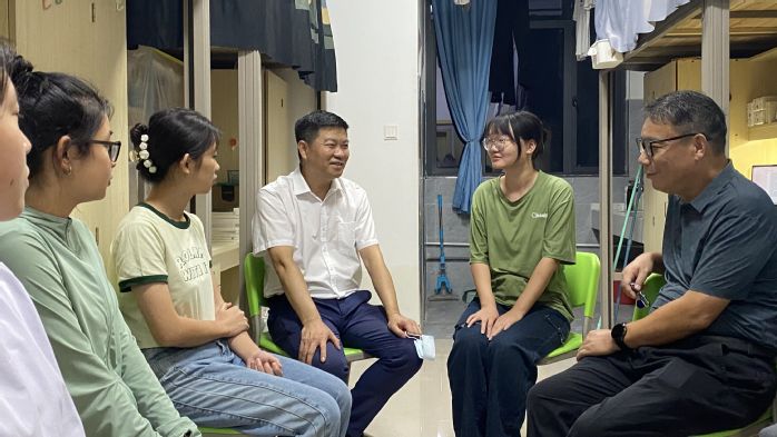 为贯彻落实学校新学期常态化疫情防控要求,持续开展“下基层、察民情、解民忧、暖民心”实践活动,2022年8月28日晚,校党委副书记马列军带队走访bevictor伟德官网学生宿舍,bevictor伟德官网党委书记严志谷、副书记陈敬道、副院长彭江浩、副院长王成以及硕士生导师、班主任、辅导员一同深入学生,核实返校数据,了解假期生活,收集困难诉求,帮助学生调整状态,尽快融入新学期学习生活。
