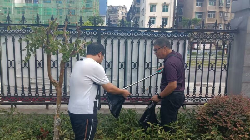 文学院教师分为多个小队对包保责任区开展校内环境清扫行动。在清扫过程中,他们着重清理了路面的烟头、纸屑、塑料袋等垃圾,将乱停乱放的自行车搬运到指定位置摆放,并对违停私家车进行了文明劝导。