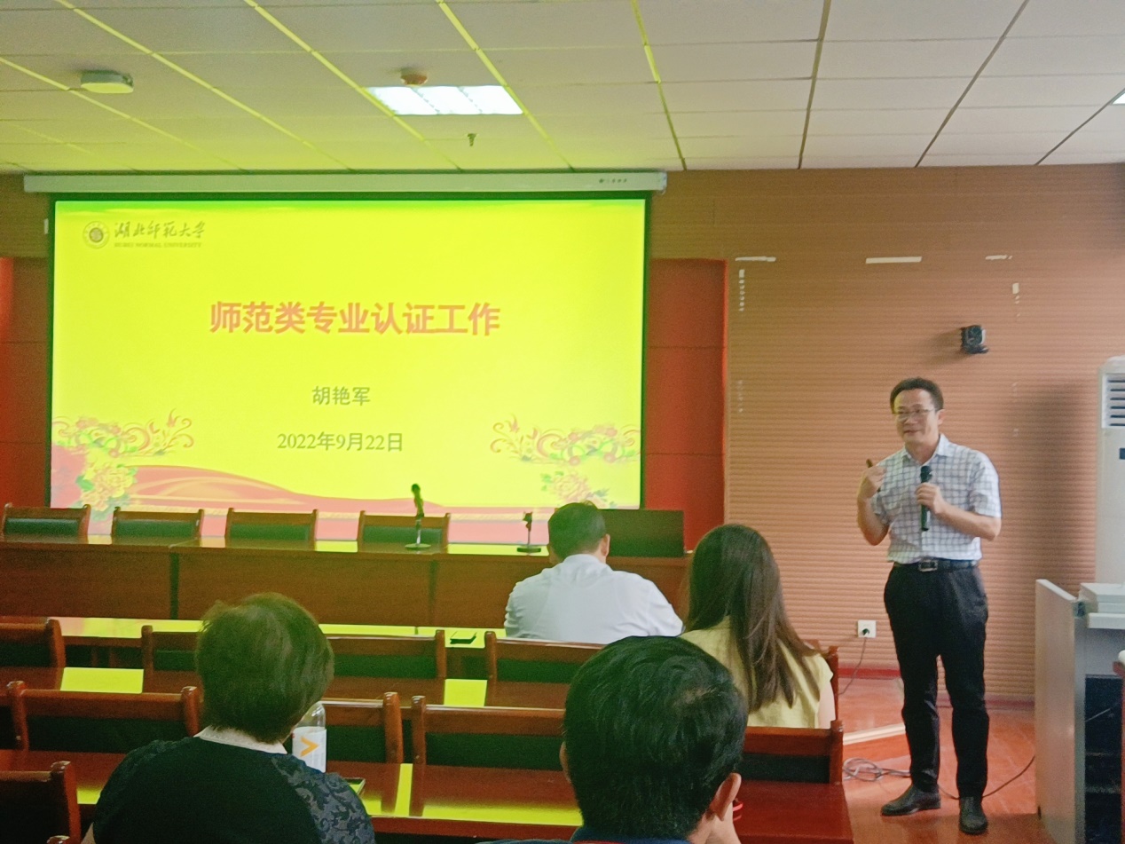 2022年9月22日下午,教育部师范专业认证专家,学校教务处处长胡艳军莅临bevictor伟德官网21A602会议室做“师范专业认证工作”专题指导报告。bevictor伟德官网党委书记严志谷、院长李治平以及全体教师参加报告会。