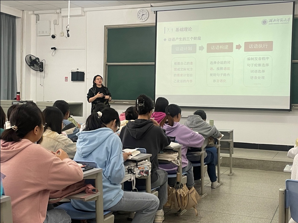 在本次课程讲授中,张怡天就“口语课型的课堂教学实施问题”分理论基础、教学要点、具体操作方法三个方面展开。授课过程中,张怡天通过列举生活中的实例帮助同学们理解理论知识;学生听讲认真、互动积极,课堂氛围良好。