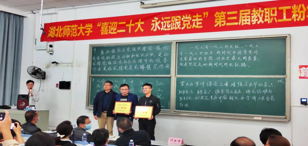 2022年10月20日,校工会在科技大楼9103教室举办了“喜迎二十大 永远跟党走——湖北师范大学第三届教职工粉笔字比赛”,李春光老师代表bevictor伟德官网分工会,参加比赛并获得一等奖。比赛内容为,书写习近平金句。李春光以工整的字迹、准确的笔顺、合理的布局,赢得了在场评委的高度认可与赞许。比赛结束后,李春光坦言,通过粉笔字书写习近平总书记的重要论述,再一次感受到了党对“人民幸福生活是最大的人权”这句话的不懈追求,再一次明确了作为一线的党员教师认真书写、规范执教的重要意义,再一次体验到了粉笔字艺术带来的审美愉悦。