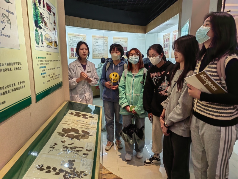 在植物标本馆中,讲解员首先为学员讲述了场馆历史。接着她在植物标本展区向学员们依次介绍了被子植物、裸子植物和植物化石等并以蕨类植物为例详细讲解了化石演变过程。在参观过程中,讲解员针对学员提出的关于标本制作与保存等问题做出了详细解答,学员们认真学习,收获甚多。