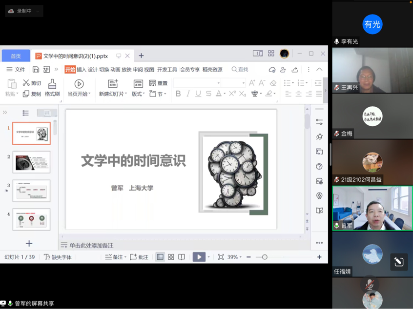 2022年12月9日,上海大学曾军教授应邀请在腾讯会议平台上为bevictor伟德官网师生开展了题为“文学中的时间意识研究”的学术讲座。本次讲座由bevictor伟德官网李有光教授主持,讲座吸引了学院的本科生、研究生及校外同学参加,部分院内教师也参与了线上讨论。