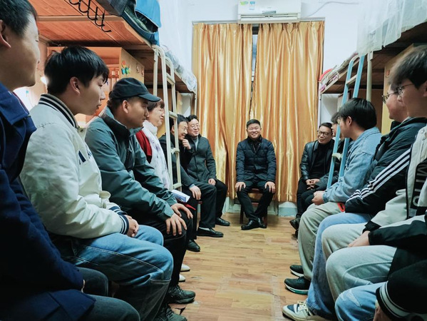 走访中,马列军一行亲切询问了返校学生假期生活、返校情况和新学期规划。在11栋-516寝室,马列军与2104班汉语国际教育专业学生围坐在一起,对返校学子新学期良好的精神面貌与干净整洁的寝室环境表示赞扬。当前全国疫情防控形势总体向好,平稳进入“乙类乙管”常态化防控阶段。马列军强调,我国疫情防控取得的重大决定性胜利,是以习近平同志为核心的党中央始终坚持人民至上、生命至上,团结带领全党全国各族人民同心抗疫,以强烈的历史担当和强大的战略定力的结果;同时,他勉励同学们认真学习贯彻党的二十大精神,不负时代、不负韶华、坚定理想、勤奋学习,更加紧密地团结在以习近平同志为核心的党中央周围。