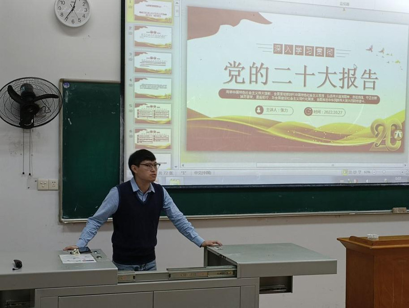 学生第一党支部书记张力以“深入学习宣传贯彻党的二十大报告”为主题,为大家讲授党课。他指出,作为学生党员要把深入学习宣传贯彻党的二十大精神作为今后一个时期首要政治任务,发扬吃苦耐劳的精神、努力提升自身素养、不断提高自身能力,踔厉奋发、勇毅前行;牢固树立终身学习理念,脚踏实地,练就过硬本领、践行青年使命,用青春的能动力和创造力激荡起奋进新征程、建功新时代的澎湃力量。