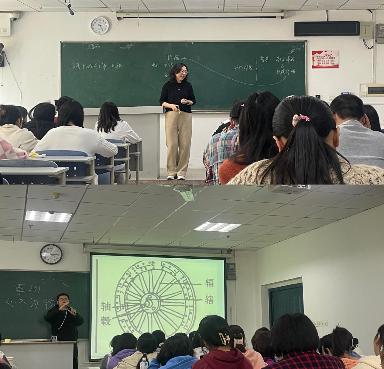 《新闻写作》课上,陈欢围绕学生课后作业,回顾消息类新闻稿书写的脉络,将学生的习作进行展示分析,强调新闻稿写作在标题、导语、主体和结尾处应该回避的问题;在让学生自己点评文章的方式中,调动了课堂气氛,提升学生问题意识,注重培养学生实践能力。祝永新则围绕着《老子》的字义及哲学思想,运用大量出土文献,在具体的语言情境中,带领大家感受从生活中生发出的古文字的魅力;同时结合自身对文本的理解,带领学生分析探索文言文的翻译及中学文言教学方法。