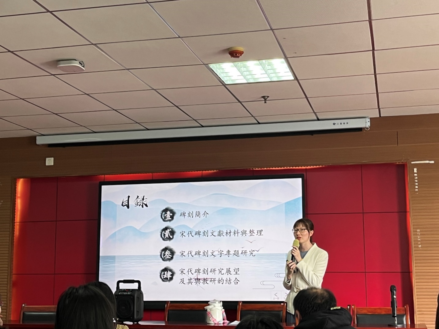 讲座伊始,和艳芳对碑刻的形制、起源、得名、分类、构成和书法价值方面进行了初步的介绍,使得同学们对碑刻有了一个大致的了解;随后,和艳芳在宋代碑刻文献材料的讲解中强调了文献材料的选择、梳理及其考证工作对于学术研究的重要性,在有充足可信的文献材料基础上方可对宋代碑刻文字问题进行进一步的论证和考据。这不仅让语言学方向的同学们受益匪浅,也激发了对于语言涉猎较少的其它方向的同学对文献整理和文字研究的兴趣。为避免在座的同学们因对于概念的陌生而难于理解讲座的内容,和艳芳在讲解中深入浅出,结合视频让大家对碑刻的制作过程有了初步的了解;而后又结合具体文献资料,给大家讲解了文字考释工作。