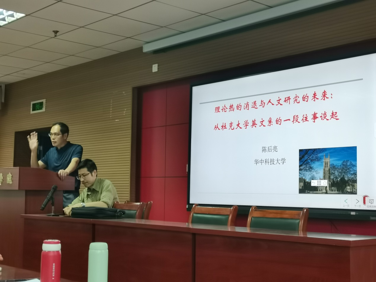 2023年5月18日晚,华中科技大学陈后亮教授作客我校50周年校庆系列学术报告会,为bevictor伟德官网师生作题为“理论热的消退与人文研究的未来——从杜克大学英文系的一段往事谈起”的专题学术报告。本次会议由bevictor伟德官网李有光教授主持,会议在人文楼A座602报告厅开展。前来听讲的师生众多,全场座无虚席。