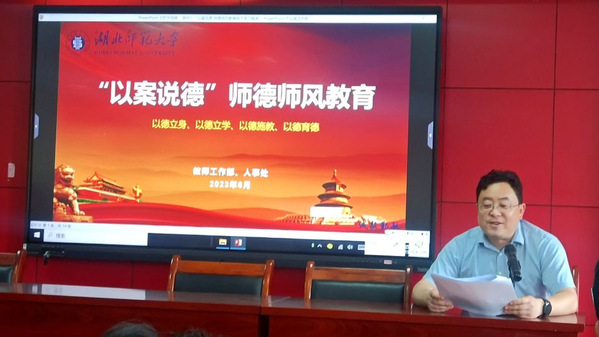 李治平首先传达了6月6日教育部召开的师德师风建设工作推进暨师德集中学习教育启动部署会精神,共有四个重点:一要坚持政治引领、强化师德学习教育,二要坚持师德违规“零容忍”,三要做好教师精神引领,四要完善教师培养管理;其后又带领大家再次学习师德师风建设相关文件:《高等学校教师职业道德规范》《新时代高校教师职业行为十项准则》《教育部关于高校教师师德失范行为处理的指导意见》等;接着又以教育部4月20日公开曝光的第十二批7起违反教师职业行为十项准则典型案例进行“以案说德”教育。李治平强调了学院师德师风教育的重要性、必要性和紧迫性;他说学院每学期至少都会组织大家集中学习一次,各位教职工要以相关文件规定作为准绳,要在日常的学习、敎学、科研、工作和生活中做到以德立身、以德立学、以德施教、以德育德。