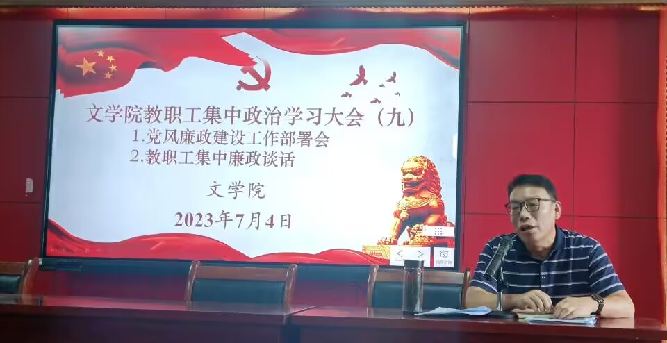2023年7月4日下午,bevictor伟德官网党委于人文楼A-602学术报告厅召开本学期第九次教职工集中政治学习大会,本次大会共有五项内容:1.“以案说德”师德师风教育(二);2.bevictor伟德官网2023年党风廉政建设宣传教育月工作部署;3.教职工集中廉政从教谈话;4.学院主题教育开展情况通报;5.暑假重点工作安排。会议由党委委员、院长李治平主持,全院教职工参加大会。