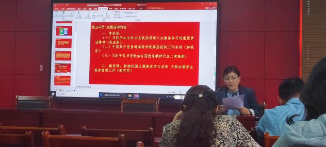 活动伊始,党员们交纳党费、诵读党章。“过政治生日”环节,刘建勋、曾颖二位同志结合自身的生活、工作经验,表达出不忘初心、牢记使命的意志和决心。本次“主题党日”学讲话环节,由祝永新、和艳芳、黄燕妮三位同志分别领学深入学习贯彻“习近平在中共中央政治局第八次集体学习的重要讲话精神”、“中国共产党普通高等学校基层组织工作条例”、“习近平总书记致信全国优秀教师代表”的重要指示精神,三位同志结合领学内容,谈了各自学习的心得体会。