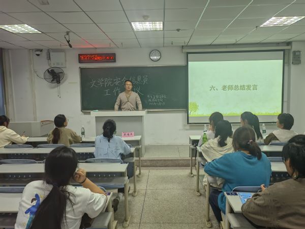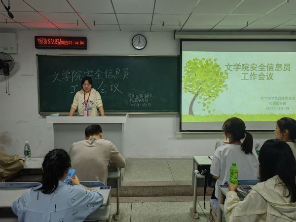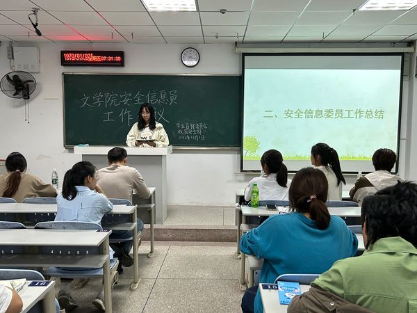 会议伊始,庞秋娜针对交通安全、心理安全、宿舍安全、网络安全、电信诈骗等方面的安全知识进行普及,同时结合案例讲解,提醒大家要注意排查身边的安全隐患;其次,安全信息员毛小雨、张珂、马艳楠三位同学对前期工作进行总结,分享了个人心得和实践经验,以及对未来的工作展望;然后,程文畅对安全信息员的工作职责、工作流程及如何处理突发事件等方面的问题进行了进一步说明;最后,吴鸿杰作总结发言,希望全体安全信息员加强学习,不断提升预防和化解校园安全问题的能力和水平,利用周末晚点名、主题班会等方式进一步加强班级同学的校园安全教育,并就下一阶段安全工作作出安排。