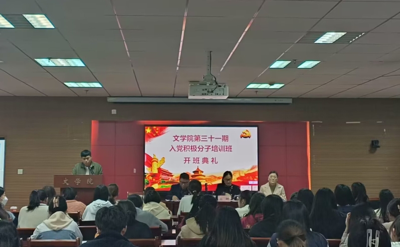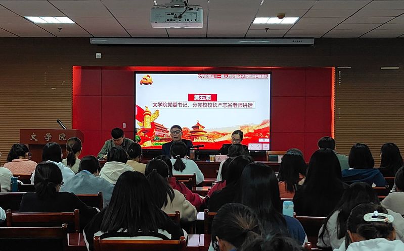 为深入学习贯彻落实习近平新时代中国特色社会主义思想,巩固第一批学习贯彻习近平新时代中国特色社会主义思想主题教育成果,切实加强对入党积极分子的教育与培养,提升其思想觉悟和政治理论水平,2023年10月7日18:30,文学院于人文楼21A602报告厅举办入党积极分子培训班开班典礼暨培训第一讲。学校党委组织部副部长应娜,文学院党委书记、分党校校长严志谷,院党委副书记郭笑笑、学生第三党支部书记陈洋、辅导员吴鸿杰以及55名新确定发展的入党积极分子参加开班。活动由院学生第一党支部书记、培训班班主任张力主持。