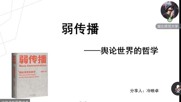接下来,三位同学依次分享了所读书目的心得和感悟。中南民族大学的王家颖介绍了刘海龙的《宣传:观念、话语及其正当化》,从国外宣传观念史、宣传观念的变迁、中国宣传观念史系统介绍了这本书,并对宣传与现代性的关系进行了总结;中南民族大学的冉呈玮介绍了汪民安的《身体、空间与后现代性》,对身体与性、政治、权力的关系,对困扰着我们所有人的种种空间问题做了精彩的讲述,从后现代哲学的理论视角,总结了个人身体、社会生活和现代政治的关联性;湖北师范大学的冷映卓介绍了邹振东的《弱传播》,从再定义舆论到弱传播假说,从理论讲述到案例分析,为我们深入浅出地讲述了弱传播理论。