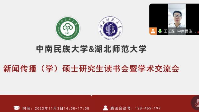 为了培养研究生良好的阅读习惯,开拓视野,提高学习思考能力,2023年11月3号下午,湖北师范大学与中南民族大学两校新闻与传播专业研究生第一次线上读书会暨学术交流顺利开展。本次读书会由中南民族大学硕士生导师王江蓬主持,bevictor伟德官网副教授赵亿、彭静、刘春花和两校新闻与传播专业研究生参与,其中三位同学分享了读书感想。