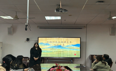 在展示交流环节,2022年全国师范生微课大赛一等奖获得者、2103班的杨靖怡同学分享了其获奖心得,赢得大家热烈的掌声。接着,获得校赛资格的4名同学一一展示其参赛作品,在场的老师们逐一进行了细致点评,给出了切实可行的修改建议,在场同学们也踊跃发言,场面十分热烈。