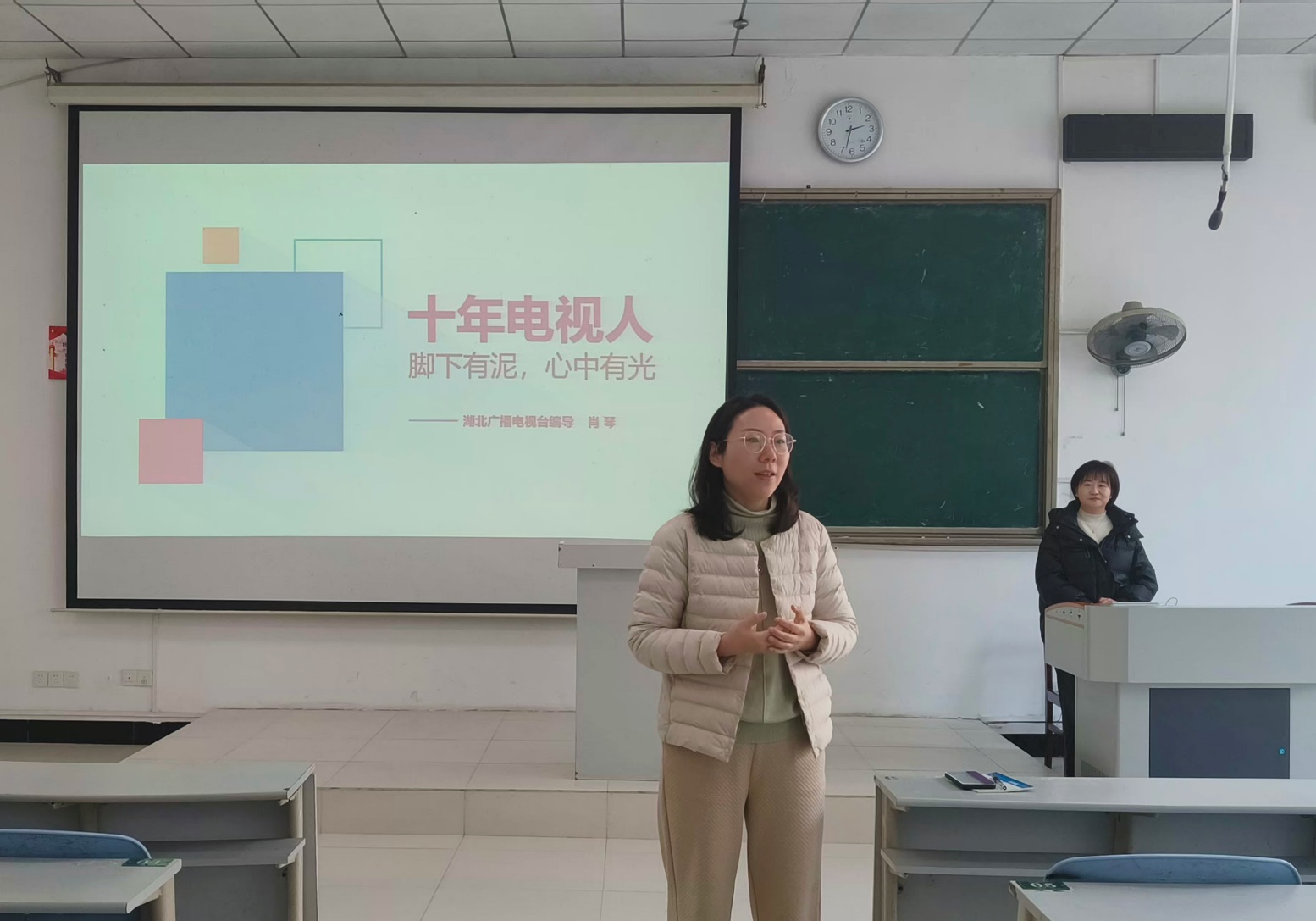 12月7日下午,bevictor伟德官网新闻传播系在人文楼21T05开展优秀毕业生经验分享交流讲座活动,邀请2009级广播电视学专业毕业生、湖北广播电视台编导肖琴,为在校学生带来了一堂理论与实践指导课。活动由系主任陈欢主持,来自三个年级的新传系学子参与聆听。