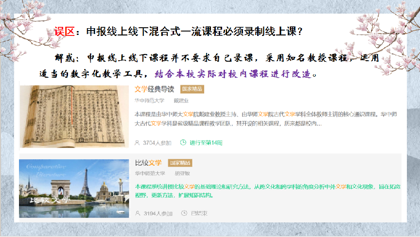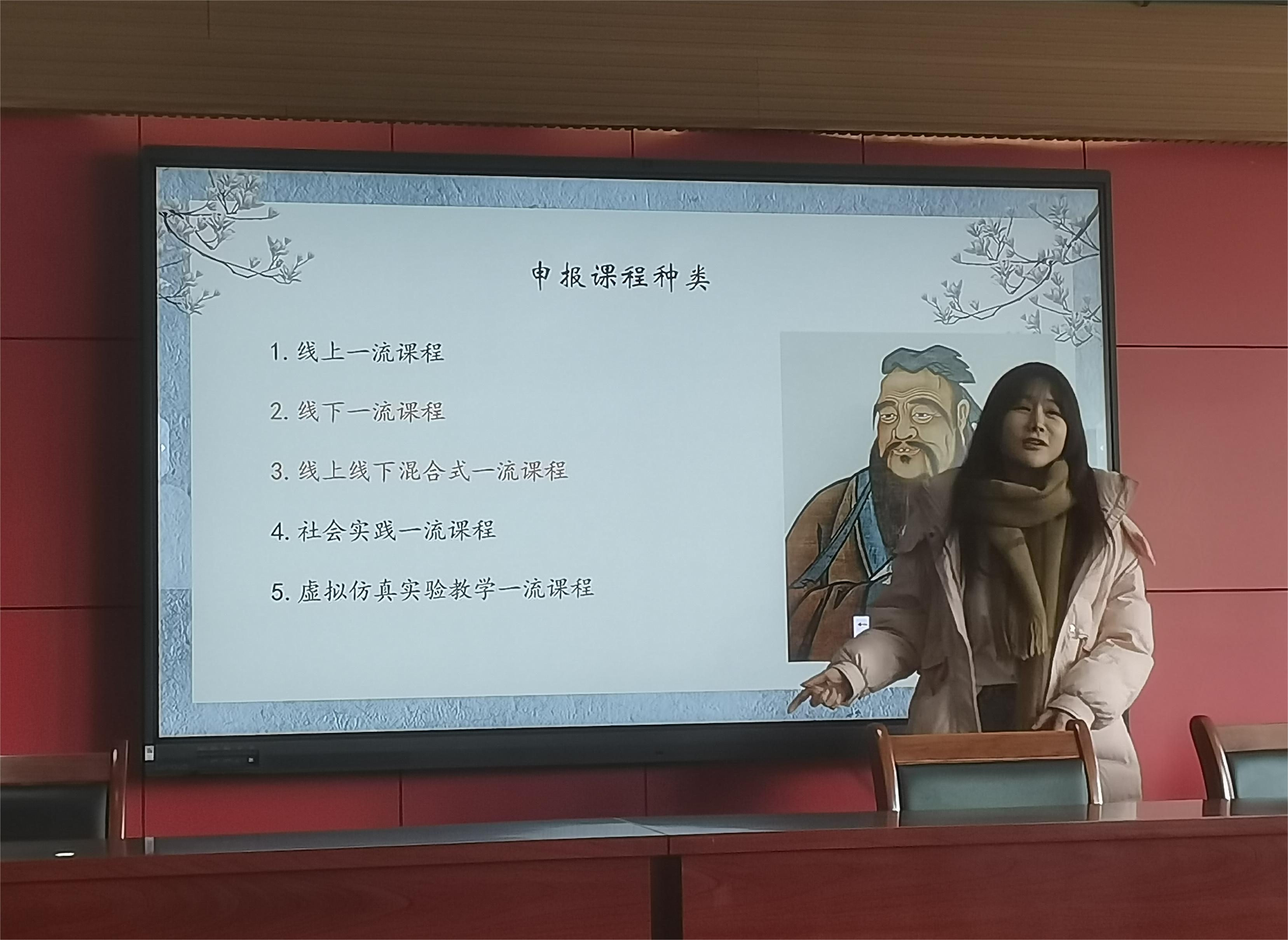 沈月是省级一流课程“中国古典诗词赏析”的负责人,她以自己的申报材料为例,首先向老师们介绍了“一流课程”申报的几种类型:线上一流课程、线下一流课程、线上线下混合式一流课程、社会实践一流课程和虚拟仿真实验教学一流课程。她建议老师们重点申报线上线下混合式一流课程,这一课程类型是将线上学生自主学习与线下课堂讲授相结合,可利用学习通、智慧树等统计学生线上学习数据,线下课堂需要采用多样化教学方法;如果要申报线下课程,则应在教学内容、教学方法、教学手段上与时俱进,具有创新性。在申报书的填写上,她建议语言表达要凝练准确,最好是图文并茂,要突出课程特色与创新,注重课程思政;在附件材料中,最重要的是10分钟的“说课”视频、课堂实录视频、教学设计样例和课程教案,这其中有些材料需要平时上课注意积累,做到有备无患。此外,她还就填报材料过程中可能会有的误区作了澄清说明。