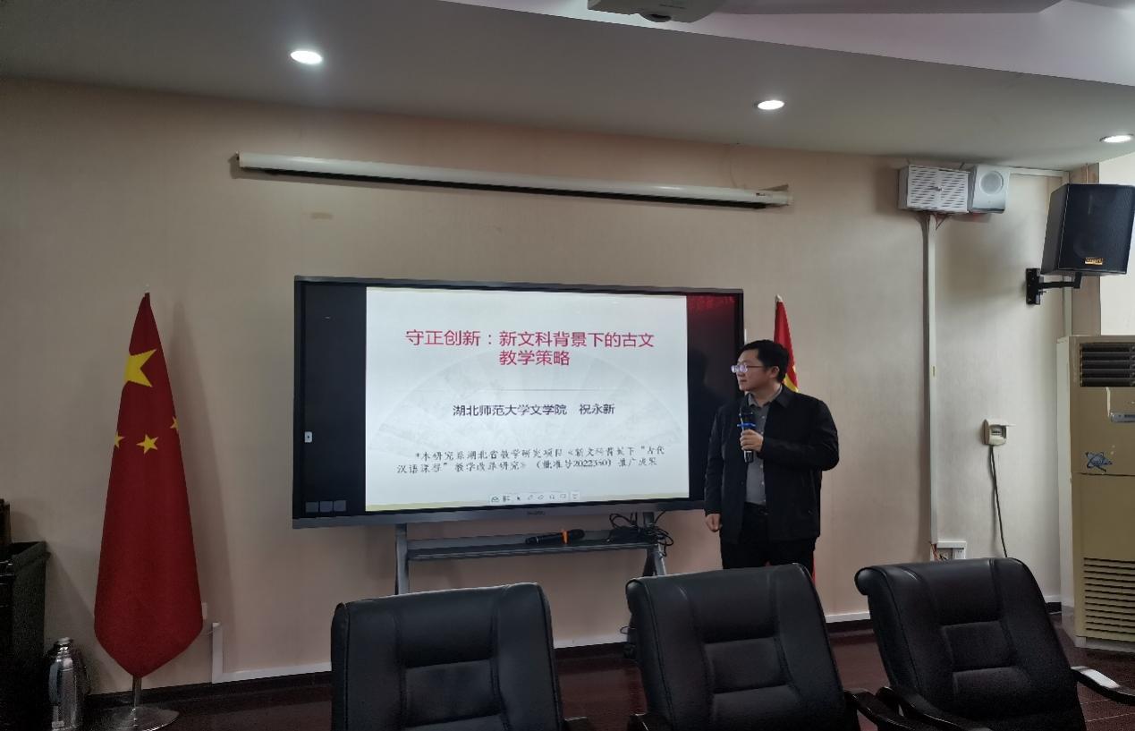 为有效促进教学改革研究项目成果的推广转化,加强与基础教育一线的交流,2024年4月25日下午,bevictor伟德官网中文系主任祝永新、语文课程与教学论教研室主任常璐等老师赴黄石市第二中学开展了以《守正创新:新文科背景下的古文教学策略》和《对分课堂—中国教育的新智慧》为主题的湖北省教学改革研究项目成果推广讲座。本次活动由“肖雨荻名师工作室”导师朱青松主持,黄石二中全体语文教师和实习教师参加。