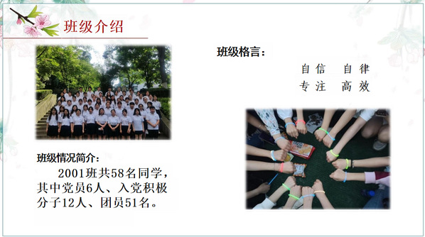 2001班班长雷宇翔围绕班级基本情况、组织建设、思想建设、学风建设、教育实践、生活闲暇、就业情况等6个方面进行班级建设成果汇报展示。现场还观看了2001班《时光篇章·感恩同行》毕业纪念视频。