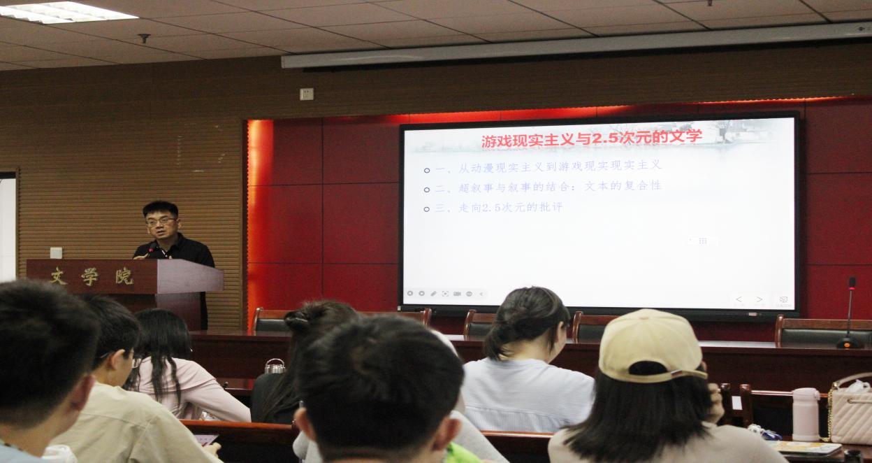 报告伊始,黎杨全教授以现实生活中的消费现象作为讲座内容的切入点,分析其“符号消费”“物语消费”的深层原因,提出第一部分内容:从动漫现实主义到游戏现实主义。他主要结合东浩纪的游戏现实主义理论、日本学者大塚英志的“动漫现实主义”等理论与多种动漫小说进行具体阐述,并且分析各种影视作品中的弹幕文化, 得出结论:传统现实主义面对的现实是三次元,“动漫现实主义”面对的现实是二次元(架空),“游戏现实主义”面对的独特现实就是2.5次元,即交互环境(三次元、超叙事)与故事(二次元)之间的互渗与碰撞。接着黎杨全教授对第二部分内容进行讲解:超叙事与叙事的结合:文本的复合性。他提出网文中穿越、重生等情节来自于重置经验,同时也对其中蕴含的大众文化发表了独特见解。第三部分的内容:走向2.5次元的批判。黎杨全教授认为2.5次元批判是从流动性、连接性去理解数字时代的文学活动,也是一种有深度的次文化批评。