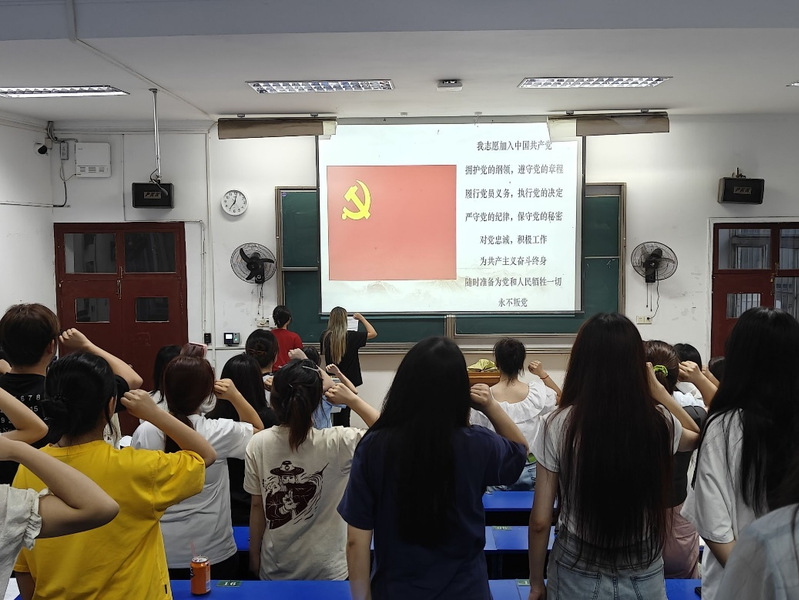 会议伊始,各学生党支部党员交纳六月党费,重温入党誓词,并集体朗诵党章。