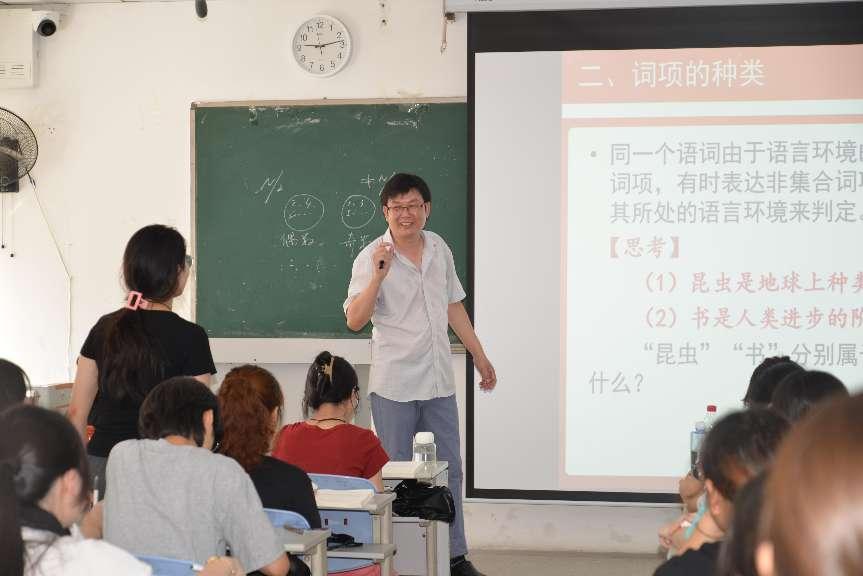 田祥胜本节课的主题是“词项”,他详细解释了词项的概念,深入浅出地介绍了词项在逻辑学中的重要性,并逐步引导学生了解词项的逻辑特征、不同种类、内涵与外延,以及外延之间的关系。整堂课条理清晰,逻辑严密,语例丰富,兼具思政性与人文性,并十分注重师生互动,且时间掌握精准,实现了较好的教学效果。