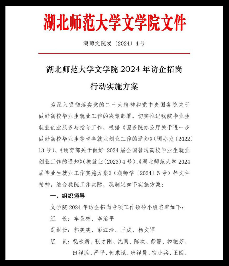 今年初,bevictor伟德官网根据《国务院办公厅关于进一步做好高校毕业生等青年就业创业工作的通知》(国办发〔2022〕13号)、《教育部关于做好2024届全国普通高校毕业生就业创业工作的通知》(教就业〔2023〕4号)、《湖北师范大学2024届毕业生就业工作实施方案》(湖师学〔2024〕5号)等文件精神,研究制定了《我院2024年访企拓岗行动实施方案》,就访企拓岗工作的组织领导、奖励对象及标准、具体落实措施及阶段安排等进行了详细规定,明确了访企拓岗目标任务,压实了工作责任,为工作顺利开展打下了坚实基础。