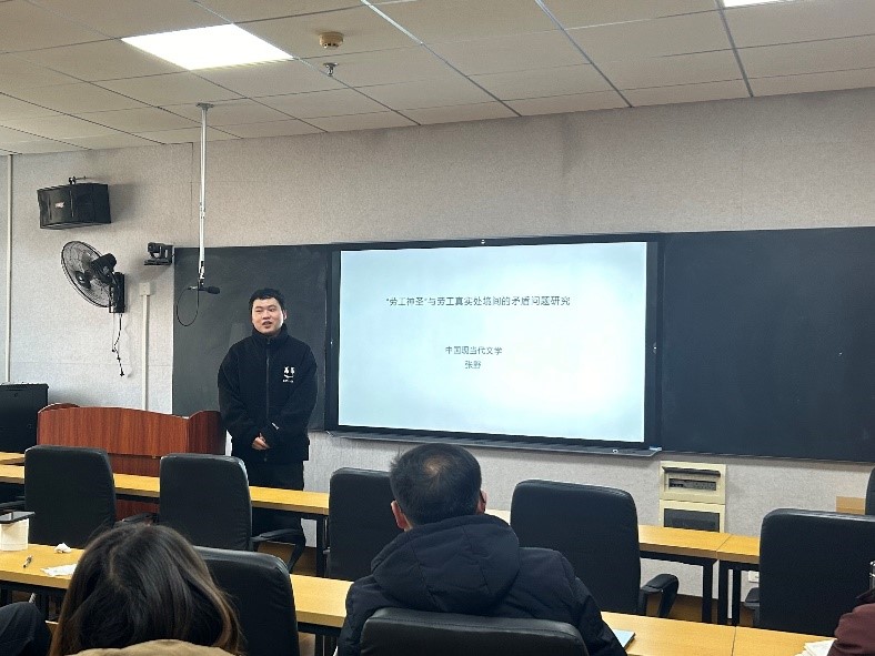 会议伊始,由现当代文学的张野同学汇报自己的参会论文《“劳工神圣”与劳工真实处境间的矛盾问题研究》,他分别就该问题产生的背景以及该问题的发现做了陈述,他认为“劳工神圣”问题的提出从出发点来看具有很大积极意义,在社会层面以及文学层面都有意识地向底层民众看去。