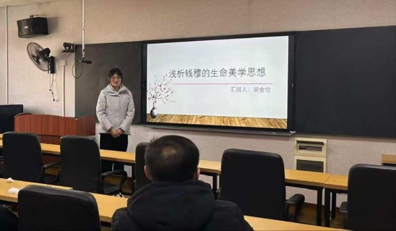 文艺学专业胡金怡同学汇报了论文《浅析钱穆的生命美学思想》,她从生命观念、生命价值和士大夫精神三方面对钱穆的生命美学思想对进行了研究。